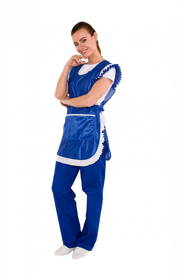 Фартук предназначен для женщин, выполняющих работы в сфере услуг. Эстетичное изделие из яркого нейлона с белой декоративной отделкой способствует привлекательности облика работниц. Фартук является спецодеждой, соответствующей санитарно-гигиеническим требованиям в сфере торговли, общепита, гостиничного сервиса и других отраслей. В области плеч и по краю подола – оборки, собранные в виде мягких складочек. Спереди пришит объёмный карман, разделённый строчкой на два отделения.