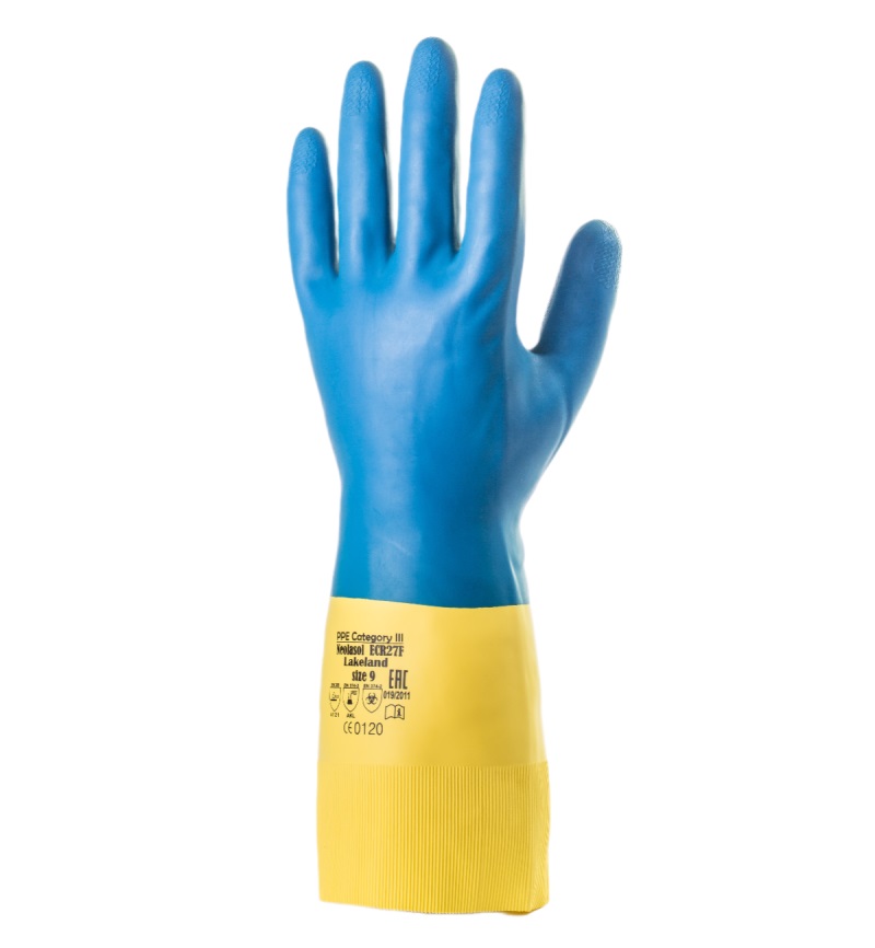 Универсальные перчатки из неопрена и латекса, форма анатомическая, применяют для работы с опасными химическими веществами широкого спектра. Обладают высокой стойкостью к химическим воздействиям. Изготовлены из латекса и неопрена путем двойного погружения, обеспечивают защиту от двойного спектра химических веществ. Внутренняя и внешняя части перчатки – разного цвета, что позволяет определить степень разъедания перчатки. Текстура «зигзаг» способствует крепкому захвату мокрых предметов, хлопковое напыление внутри перчатки обеспечивает комфорт.