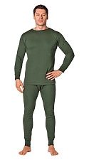 Нательное бельё обеспечивает гигиену и комфорт для тела. Комплект зелёного цвета предназначен для надевания под спецодежду в тёплое время года. Верхняя часть одежды выполнена в виде футболки с длинным рукавом с манжетой. Овальная горловина окаймлена двойной бейкой. Кальсоны – ровные, не сковывающие движений. Качественный трикотаж обеспечивает воздухообмен и впитывает излишки влаги в процессе потоотделения. Швы обработаны специальной строчкой, обеспечивающей эластичность изделия.